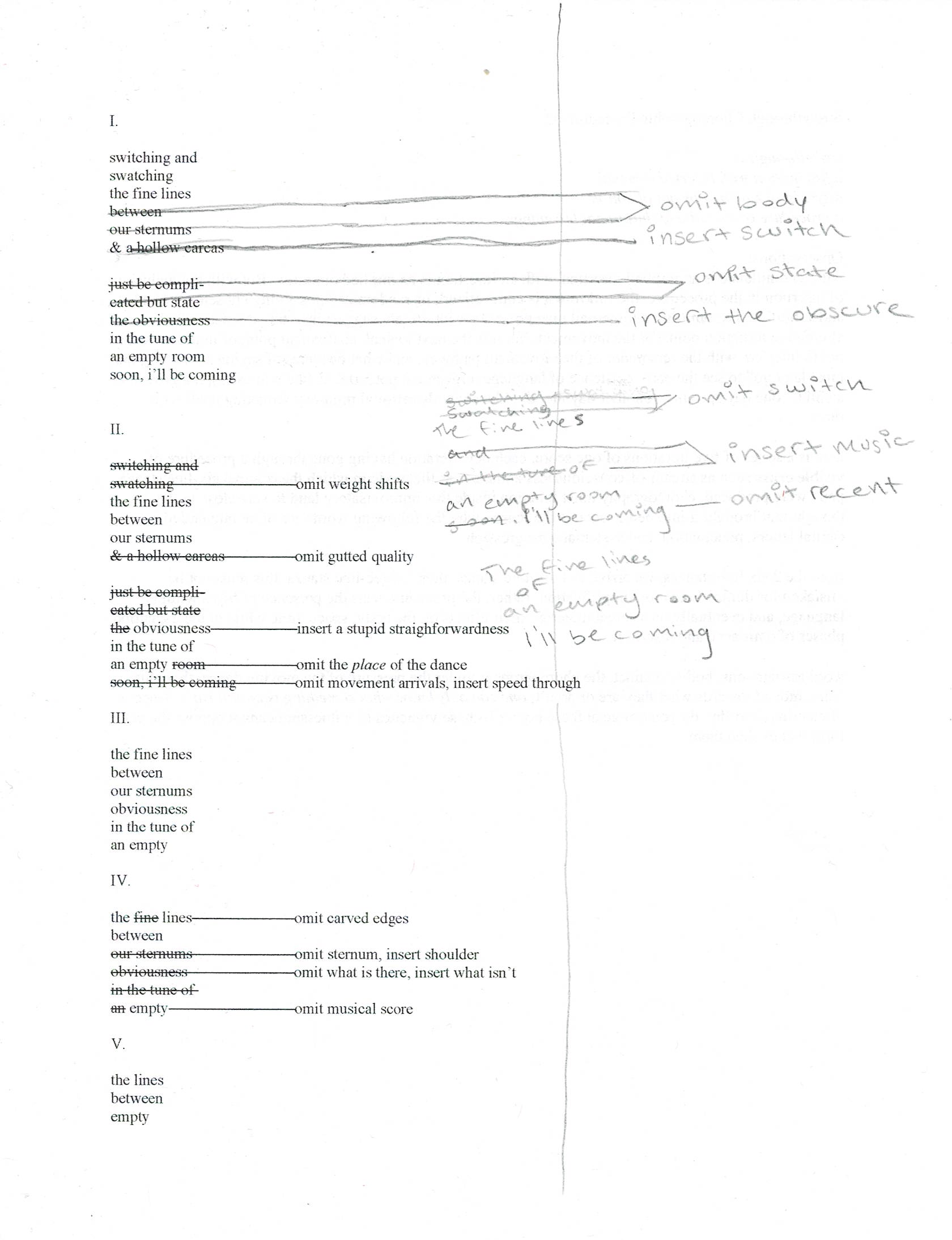With a shorter time frame, I decided to lead my workshop in reverse, instead presenting the participants with an example of a completed strikethrough procedure, and offering them the chance to rewrite the same poem through their own process of strikethrough. I instructed them to draw a line down the center of the page and alongside strikethrough #1 they chose their own omissions and insertions to culminate with a completely different set of words for section III. and the final section V. Compared with the earlier workshop where the participants had no preconception of strikethrough, this workshop presented them with a preconception, which coincidentally eliminated the purpose of the procedure, which is for the writer to adapt their stream of consciousness writing into a concise fragment through choreographically oriented edits. This served helpful as an exercise, and rather taught the students to be more professional editors of others’ work as opposed to personal editors of their own. It forced them to take apart an already fully formed work, detach from notions of completeness in any medium, whether it be poetry or choreography. Poets are interpreters, so are choreographers; we must gain the ability to fold and cut and glue and fold and cut again.