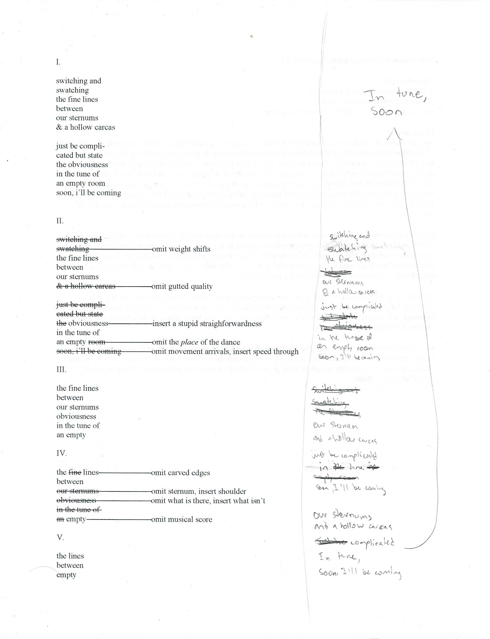 As a preliminary introduction to the field of “dance writing” and to warm up the students to the idea of conceptualizing dance through choreographic script, I had them read excerpts from “Rethinking Dance Writing” by Alys Longley at the University of Auckland. This article contained the writer’s reflections on her rehearsals for a duet called Little peeling Cottage, including inserts of choreographic poems she used to instruct her collaborative partner’s improvisations. Strikethrough functions similarly, in that the procedures serve the choreographer in instructing her dancers through movement creations. (In the case of my first rehearsal, I used the procedures to enhance my choreographic eye, the erasures inserting themselves as “stops,” where normally an edit might not be made).